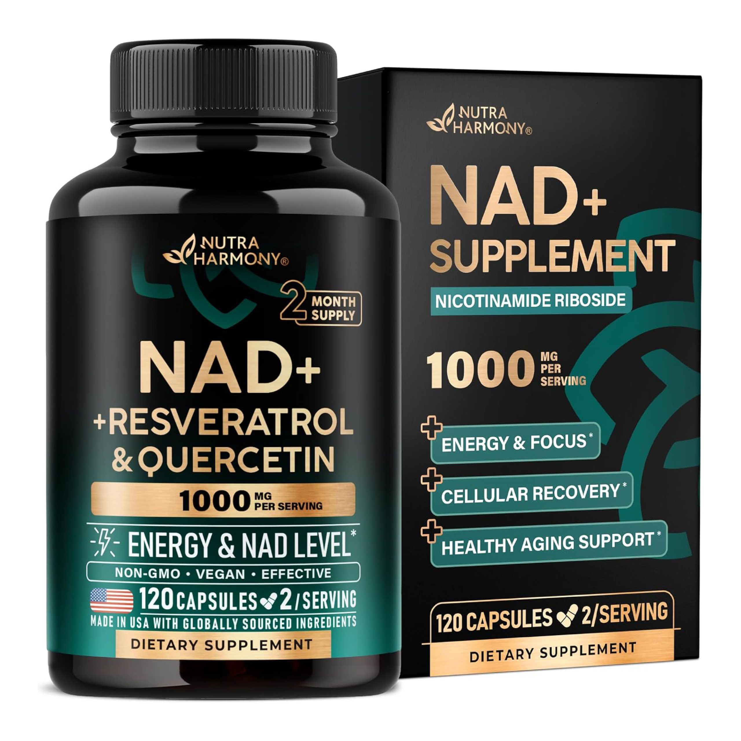 Nutra Harmony NAD+ Supplement combines the power of NAD+ precursors, Resveratrol, and Quercetin to support cellular energy, healthy aging, and antioxidant defense. This advanced formula helps boost natural NAD+ levels—essential for mitochondrial function, DNA repair, and overall vitality—while protecting cells from oxidative stress.