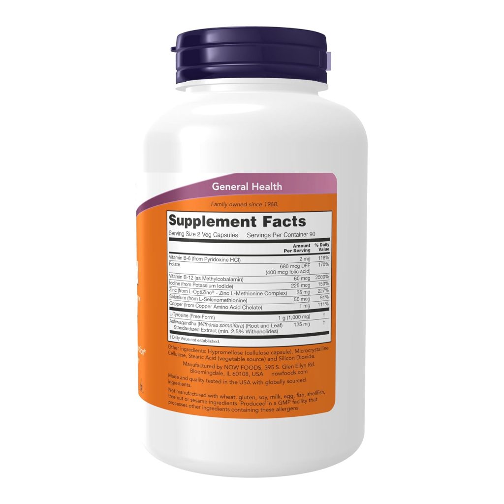 NOW Thyroid Energy is a complete thyroid support formula that blends iodine, L-tyrosine, zinc, selenium, copper, Ashwagandha, and guggul extract to promote optimal thyroid function and energy metabolism. This synergistic formula helps maintain hormonal balance, supports focus and vitality, and encourages a healthy metabolic rate.