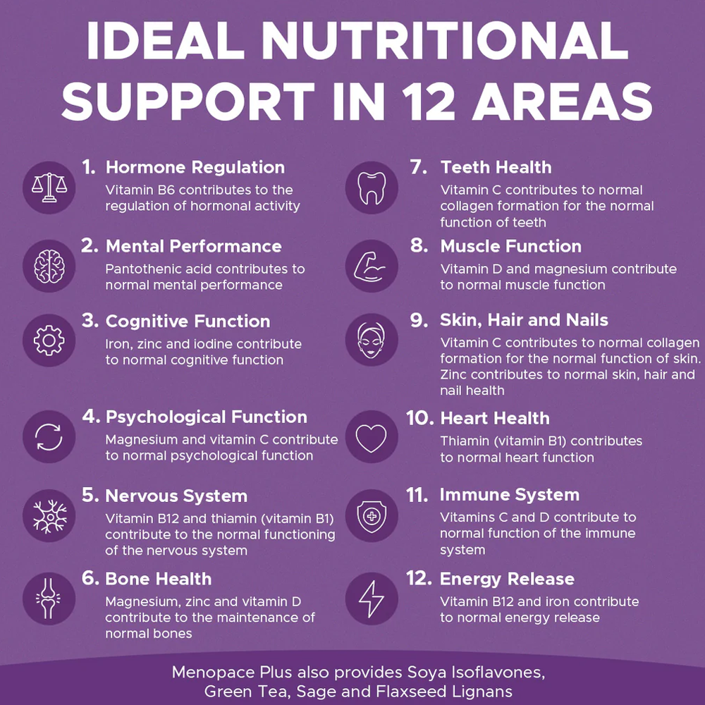 Vitabiotics Menopace Plus is specially formulated to provide advanced nutritional support for women during perimenopause, menopause, and post-menopause. This comprehensive supplement is designed to help maintain overall health, hormonal balance, and wellbeing during this important stage of life.