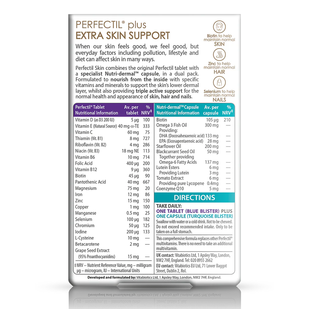 Vitabiotics Perfectil Skin is specially formulated to provide advanced nutritional support for healthy, radiant skin. This premium supplement features a patented dual formula, combining multivitamin tablets with Nutri-dermal™ capsules to deliver nutrients both internally and at the skin level.